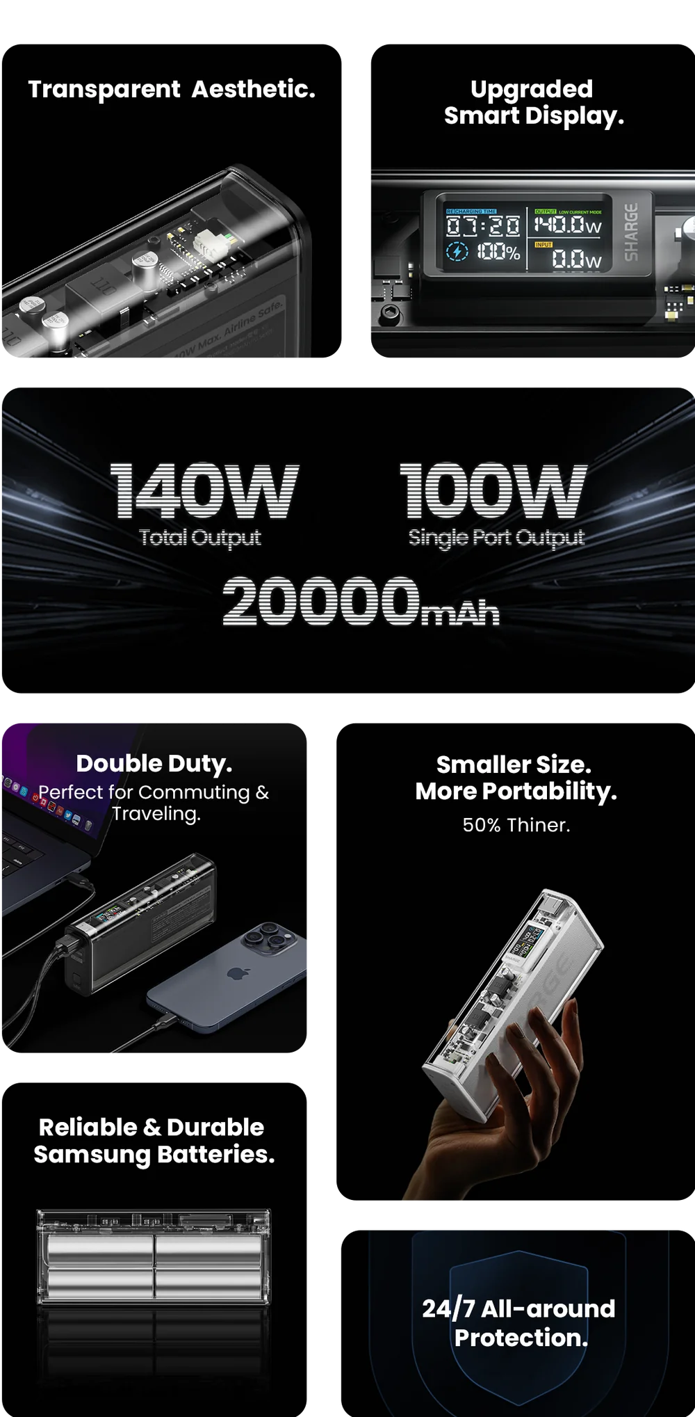 Powered by 4 advanced Samsung 21700 batteries, Shargeek 140 comes with 1.5x longer-lasting battery life, built to last for years.