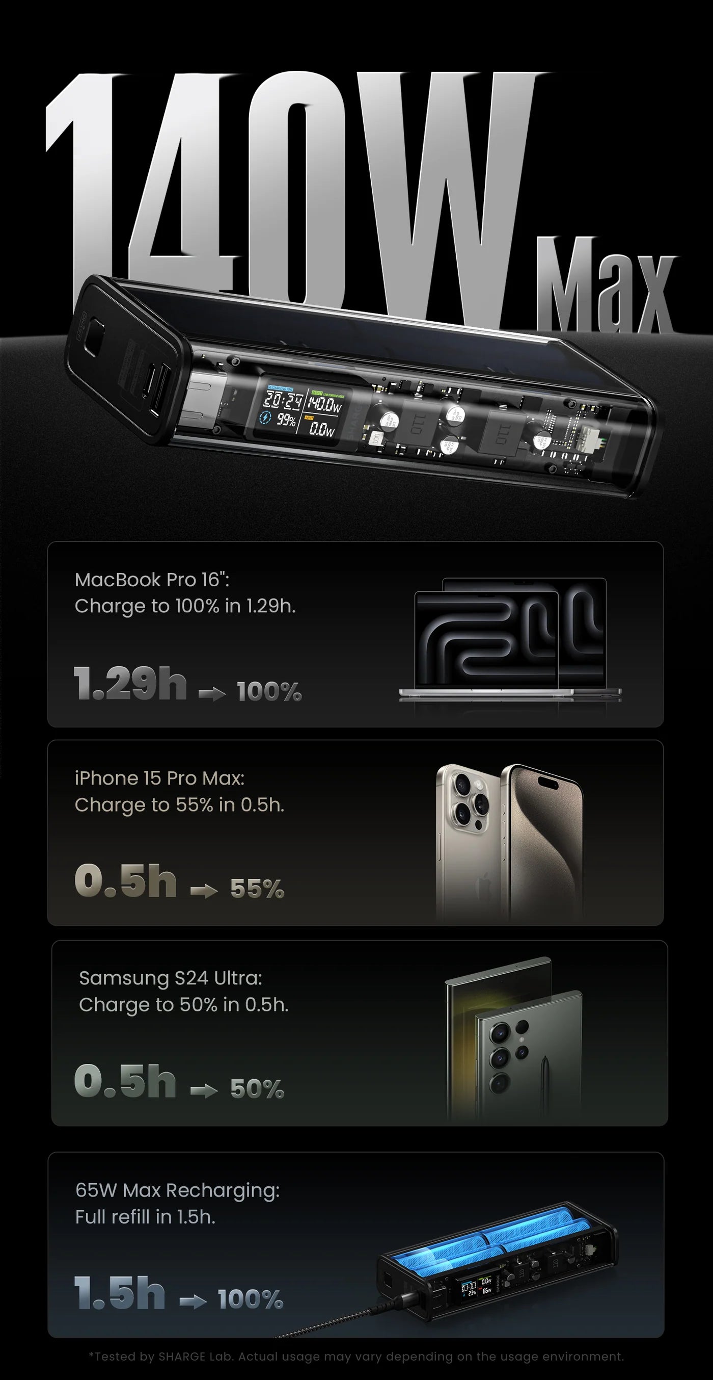 Max 140W power with max 100W single port output. Charges up a MacBook Pro from 0%-50% within only 40 mins, iPhone 16 Pro from 0%-50% within only 30 mins.